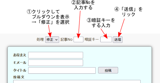 「記事NO」は投稿済の記事の番号です。下の図の例で言うと 33 ということになります。